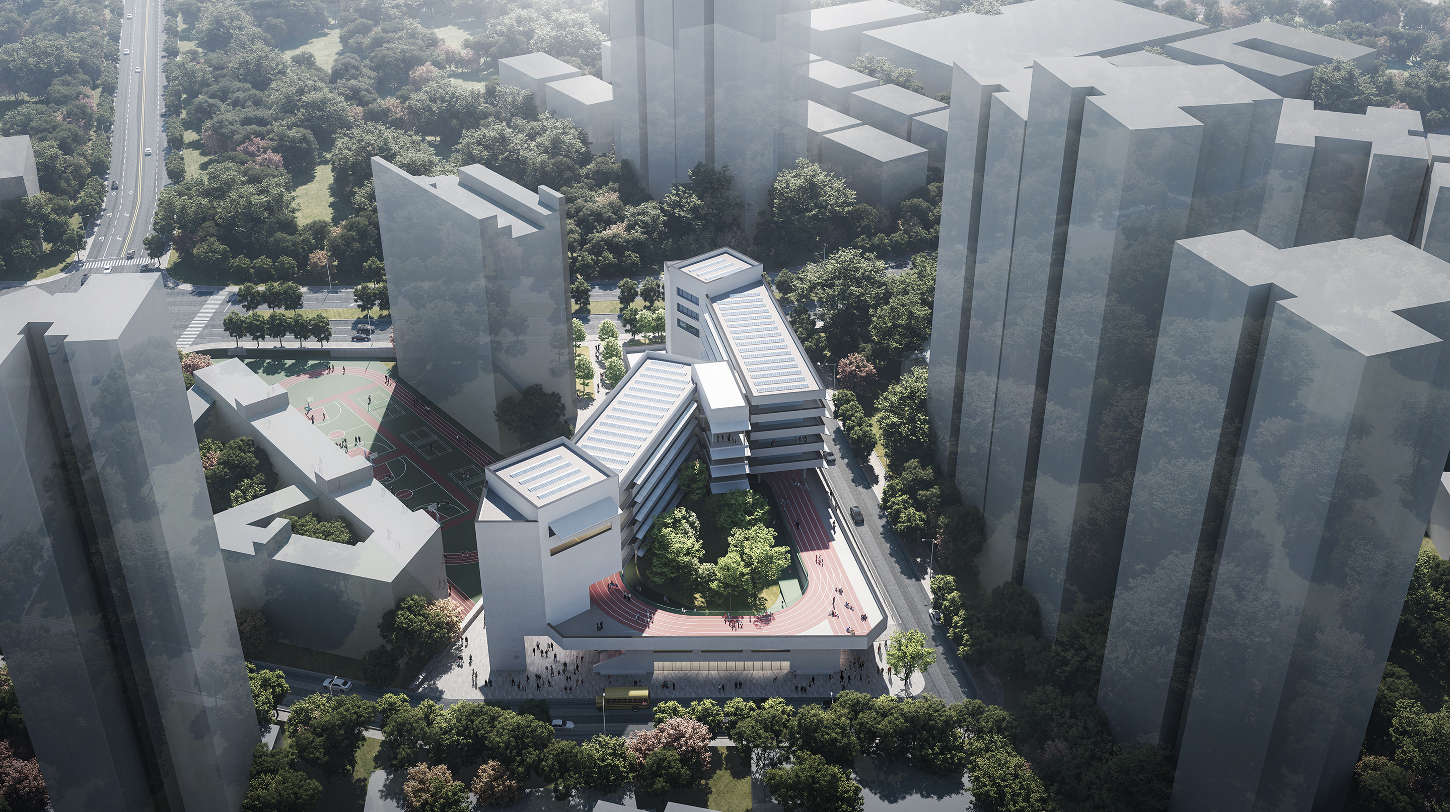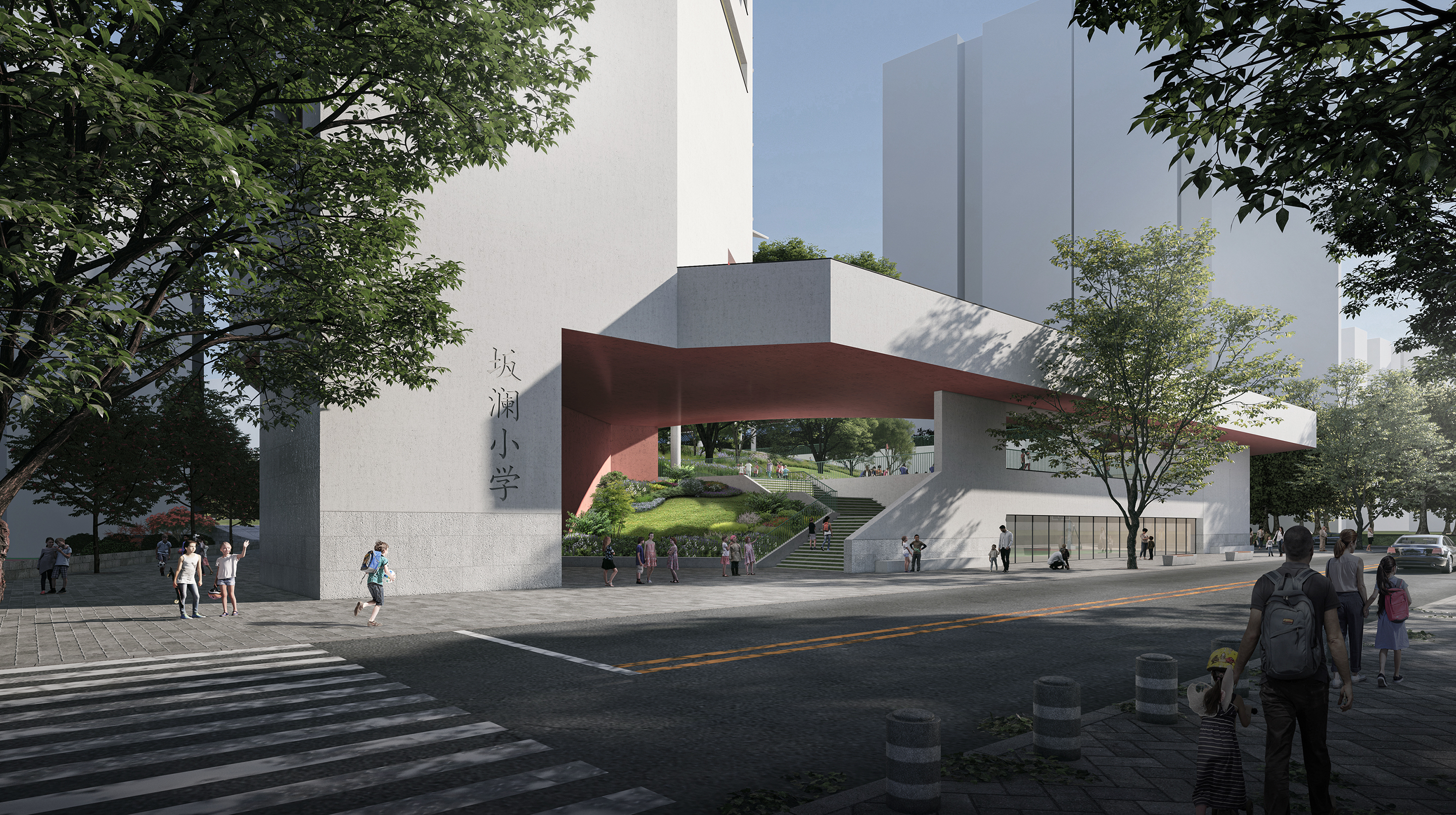 坂澜小学的设计调和了复杂紧张的场地。其主活动层被抬高,在其下城市边界上布置体育馆、图书馆等空间,形成积极、公共的边界;利用原有的土方“筑绿”而成的大“树池”让树木茁壮生长,成为学生感受自然的场所。我们挖掘出场地上仅有的两条视觉通廊,设计了以学生活动为主的两个端部节点,使得学生既可以在自然中活动,也可以“远眺”城市景观。