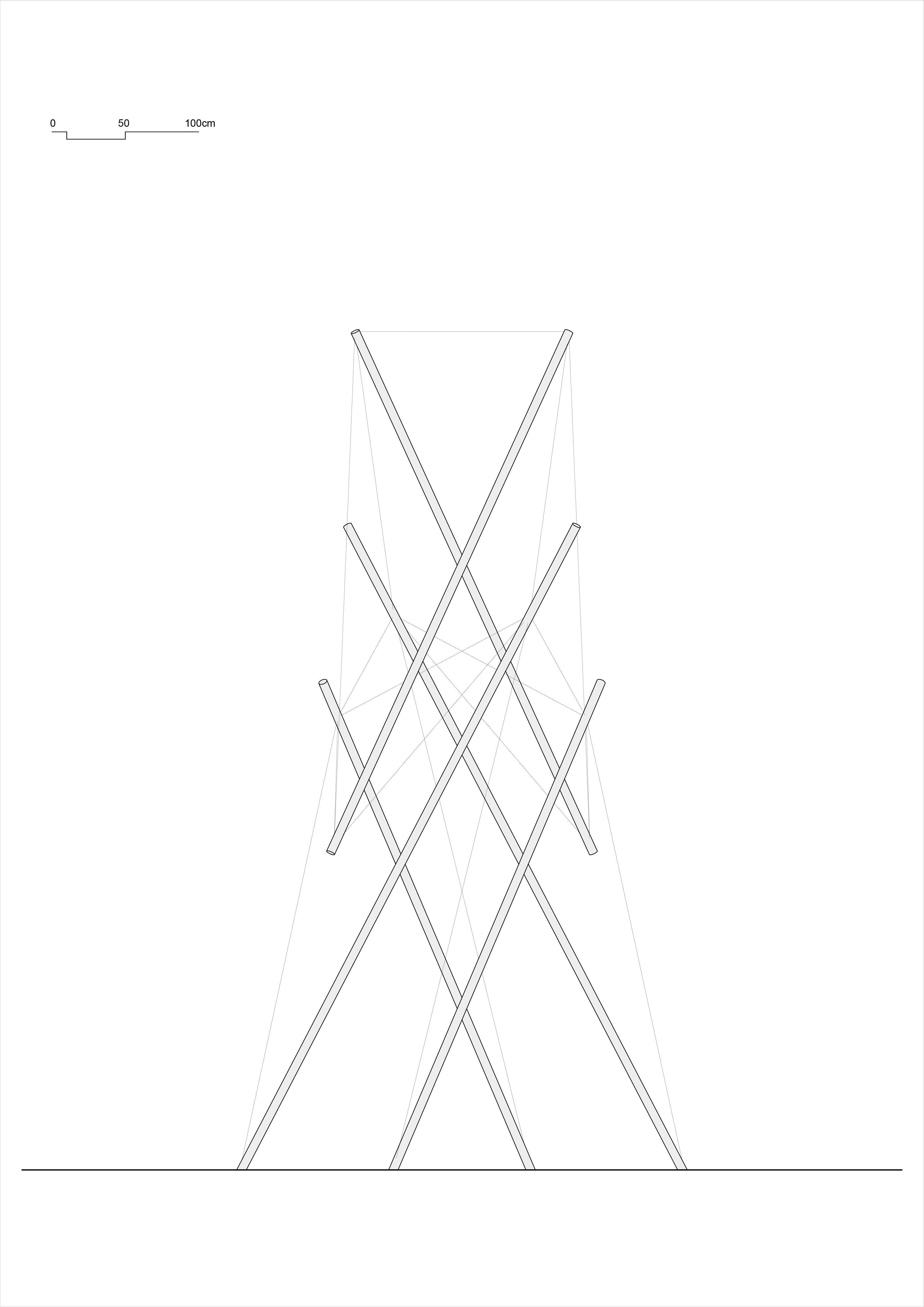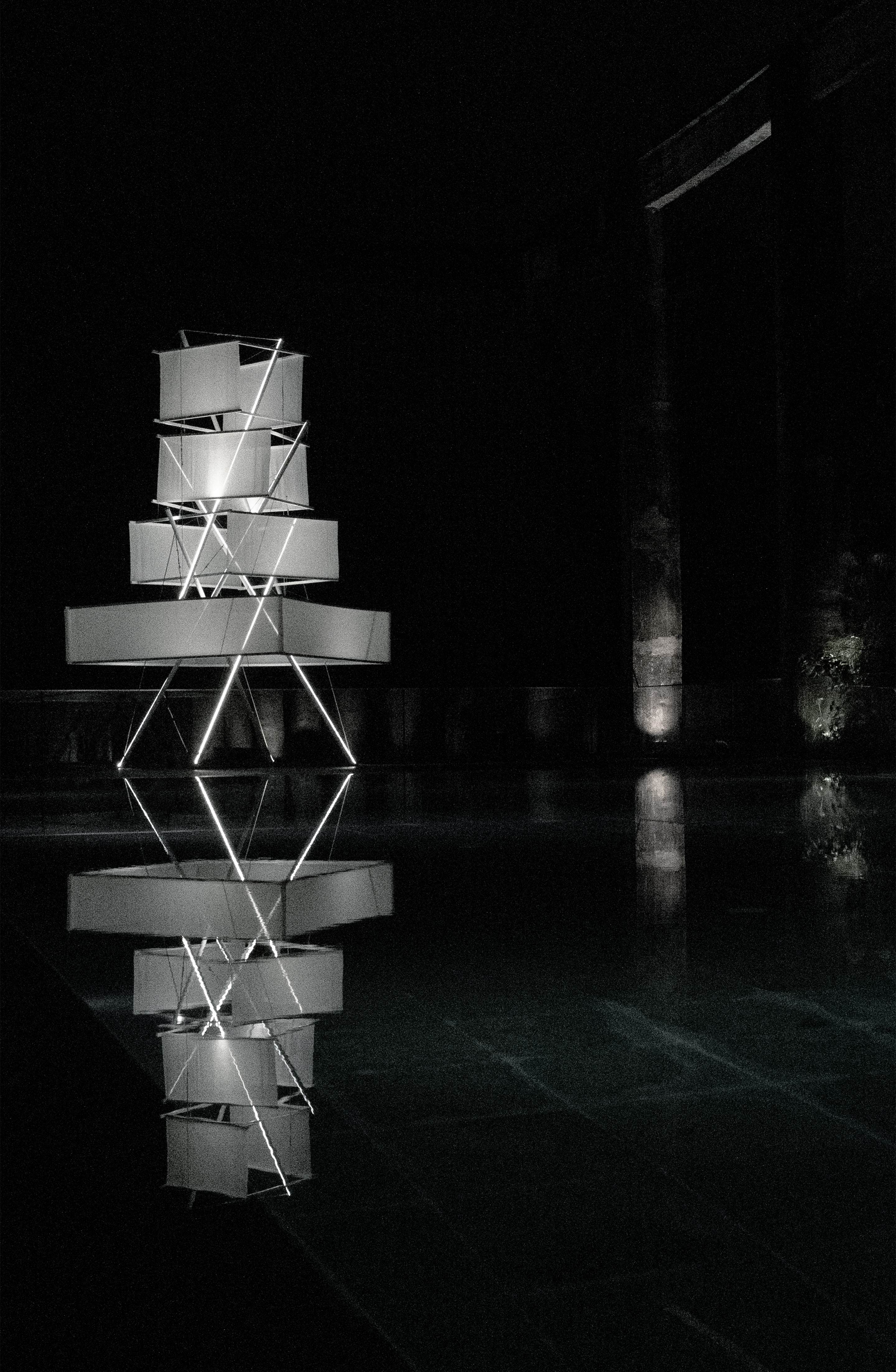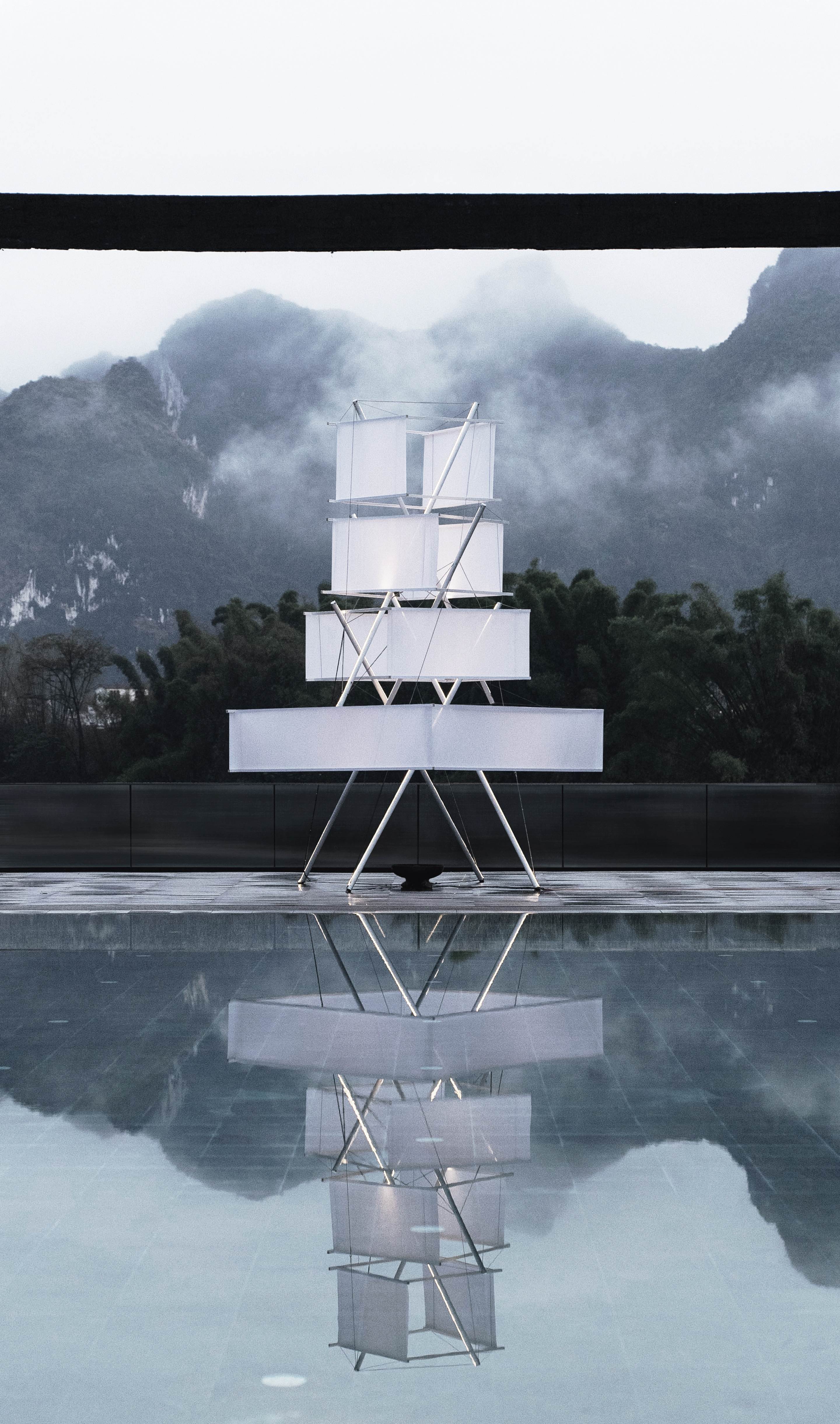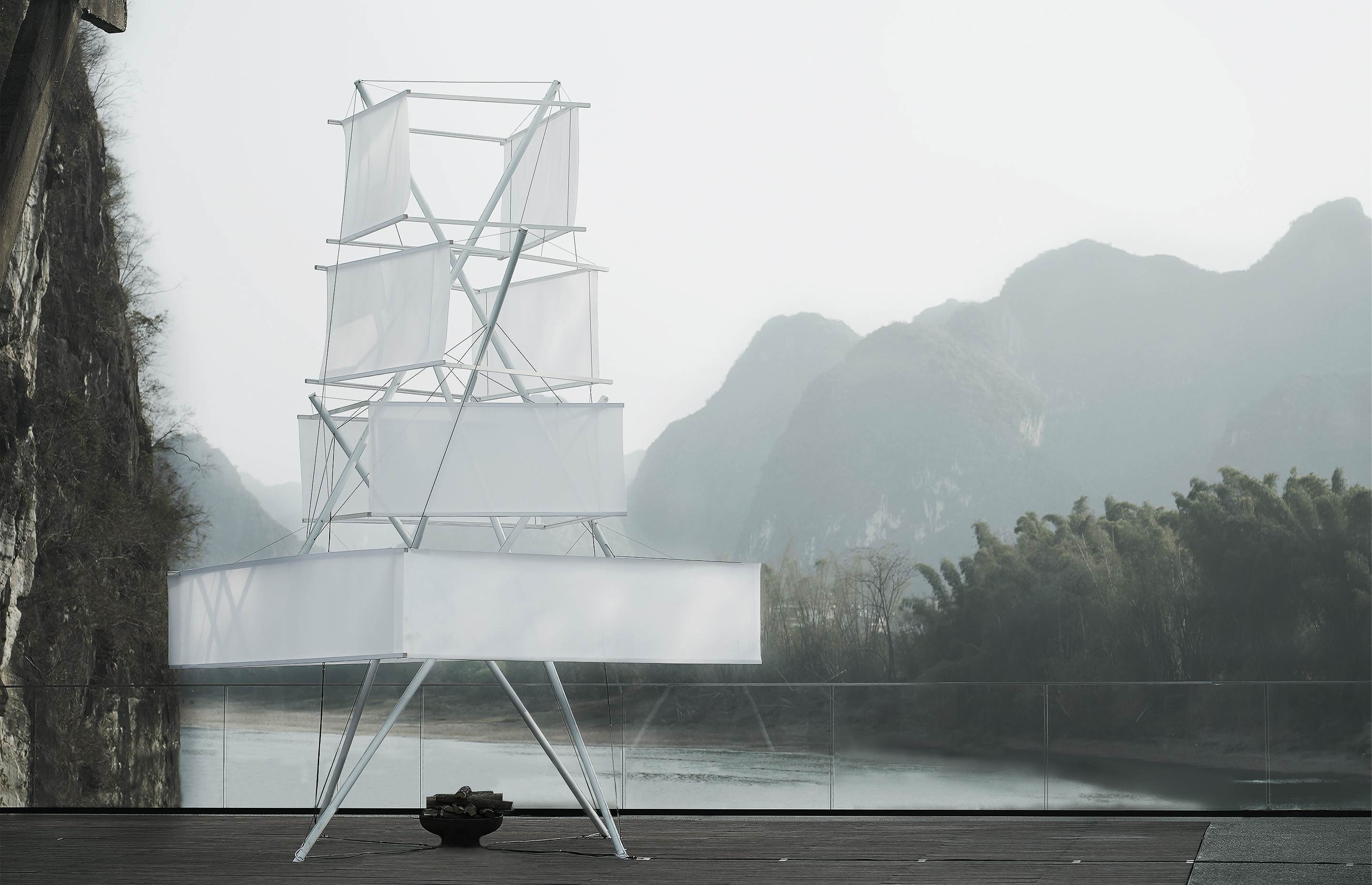 凇明火塔具有少数民族精神深处高洁的神木的气质,张拉整体结构使火塔的各个构件完全分离,三组杆件在平面上旋转,在立面上穿插,由拉索互相牵制,形成了火塔的骨骼。四组“面纱”悬挂在杆件上,“面纱”的旋转揭示了不易察觉杆件方向的变化。塔体能够随风轻微运动,使其获得一种生命特征。